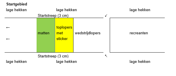 - Laat deelnemers van achteren een startvak betreden en houd hierbij toezicht